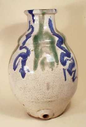A massive stoneware bottle from one of the six ancient kilns, with cork-hole at the base, and white slip and overglaze blue and green freely applied and flowing decoration.