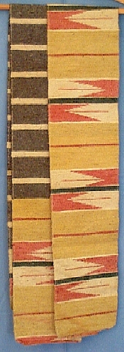 | A very handsome production, this obi combines a light yellow-tan, soft light red, and brown and buff stripes, of silk sakiori with the arrow-vane sections achieved through tapestry techniques. | |