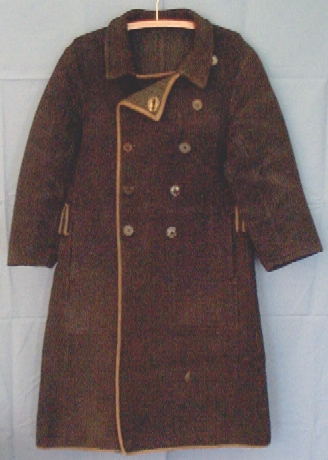 with tan twill cotton, double-breasted with early plastic-like buttons with the holes