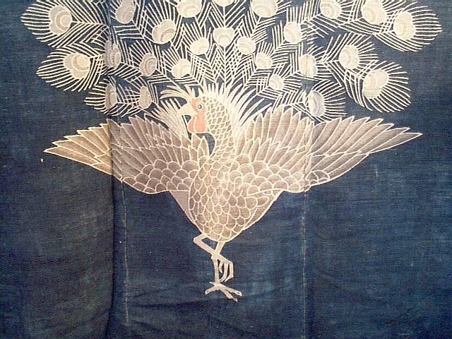 cover for child with peacock and mountains An unusual design, which seems to undoubtedly be a peacock, although the ends of the tail feathers resemble those of the phoenix as traditionally depicted. He stands on one foot in chaarming indecision, looking at us from one eye. In the background, three mountain tops are suggested, with dots indicating moss. The tail feathers are drawn with special fineness and care; see detail below. Dimensions about 38" x 59" on three panels of traditional loom width. The background (which is evenly colored) has faded to a soft and tweedy medium blue, with the drawn design in tones of reds, tans, and gray. |