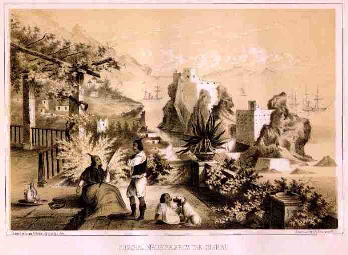 | "FUNCHAL, MADEIRA, FROM THE CURRAL, Drawn from Nature by Heine, Figures by Brown. Ackerman Lithograph, 379 Broadway N.Y." |