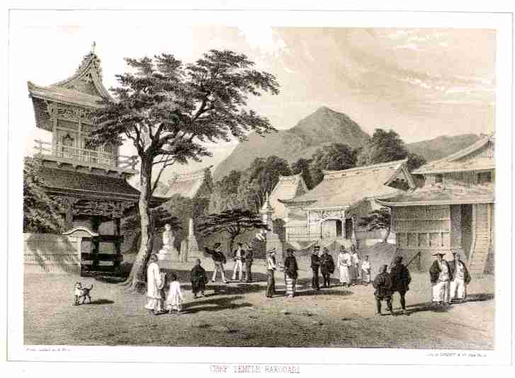 | "CHIEF TEMPLE, HAKODADI [Hakodate]; From nature by W. Heine, Lithograph of Sarony & Co., New York" |